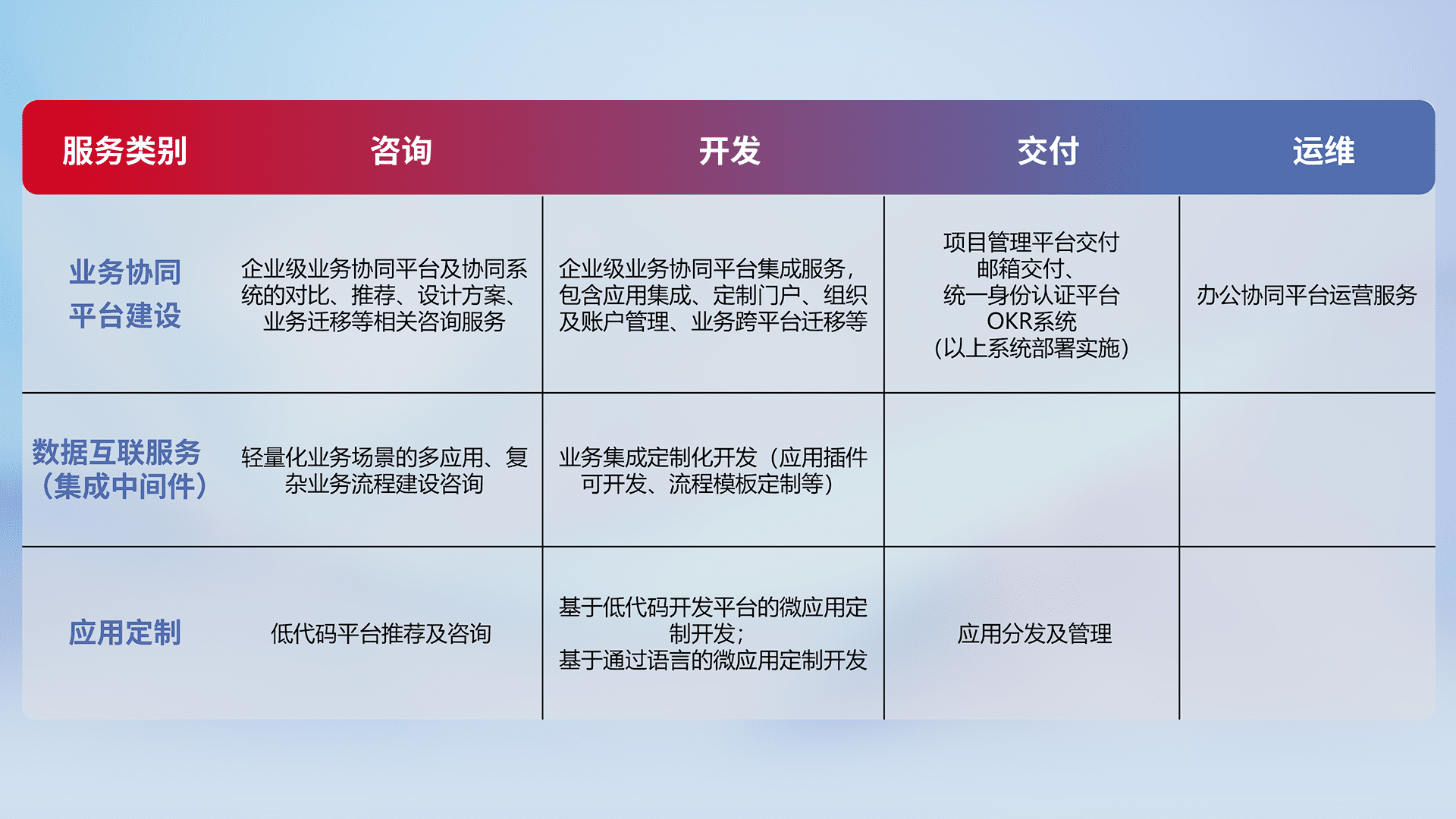 针对钉钉、、企微、、IDaas等平台级产品提供产品的规划、、、方案、、交付、、定制化开发等服务,,实现如统一协同办公、、智能客户服务、、、、混合会议管理、、智能数据查询、、、等业务场景,,实现数字化转型。。。。