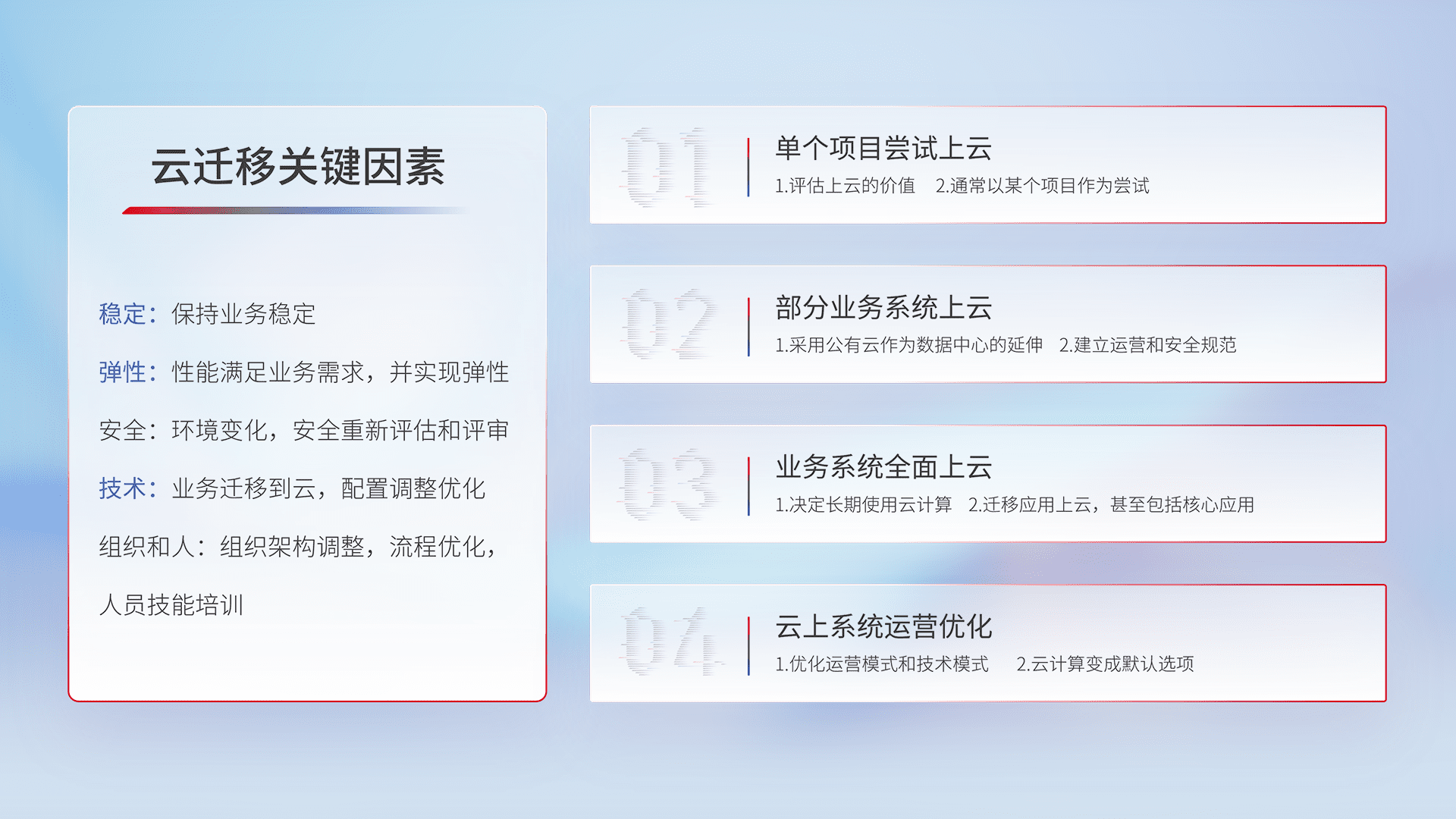 结合实际业务,,,,从规划设计、、、、云平台选型、、、、云原生改造、、、、数据迁移、、、、集成交付,,,,迁移全过程为客户识别最佳上云路径,,,,做好风险识别管理,,,,设计网络架构、、、身份权限、、安全审计合规、、、、操作审计、、、、日志审计、、、、监控告警策略、、、、多站点容灾设计等,,,,对云上基础设施进行整体规划,,,提升IT治理水平,,,,以满足弹性、、、、高可用、、、高性能的需求。。。。