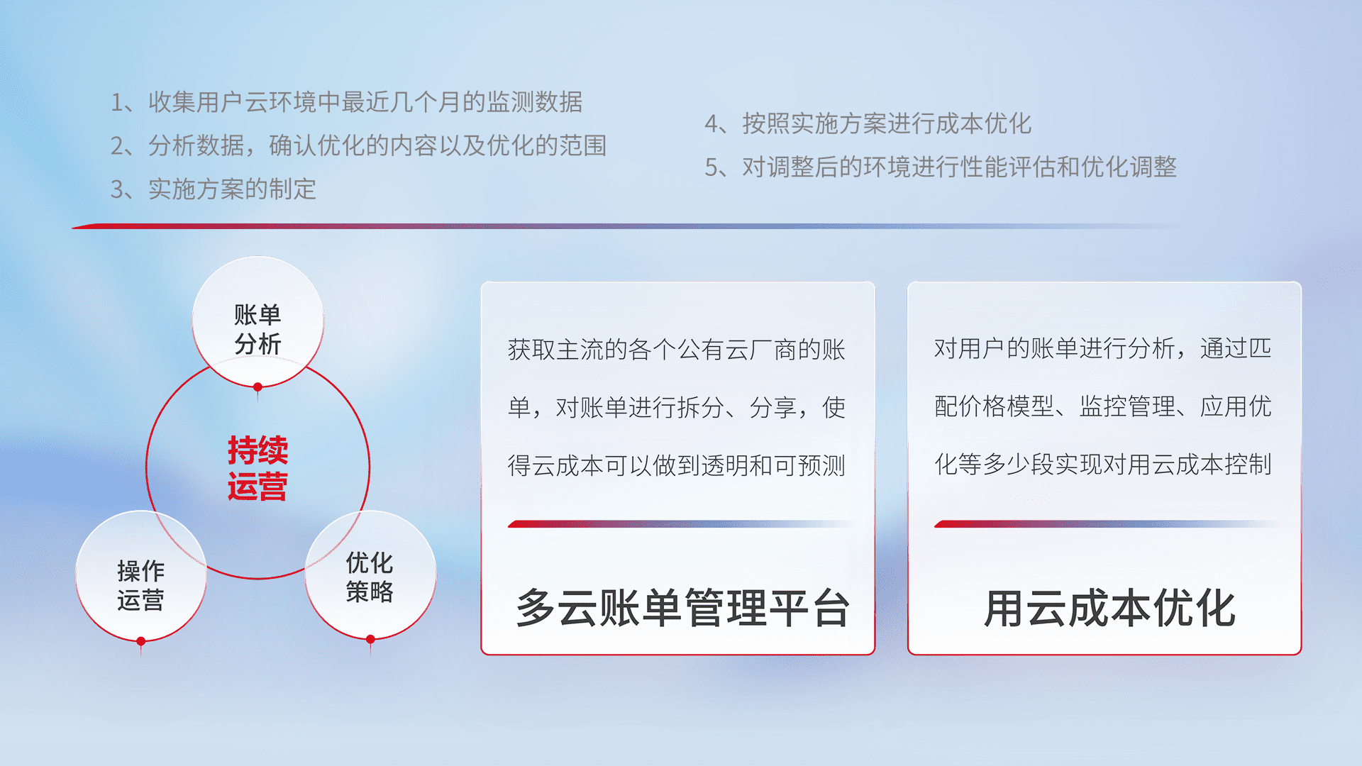 通过多云纳管,,以统一的资源数据模型把客户的云资源进行抽象和封装,,,进而实现对多云资源的统一操作,,,,保障云资源管理的可靠性、、、、稳定性与可用性。。量身定制化运维内容,,,配置、、开发运维、、补丁管理、、备份、、监控、、、认证和访问管理、、审计和日常巡检等,,保障在用云过程中的可靠度,,,,稳定度以及高可用率。。。。